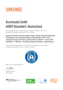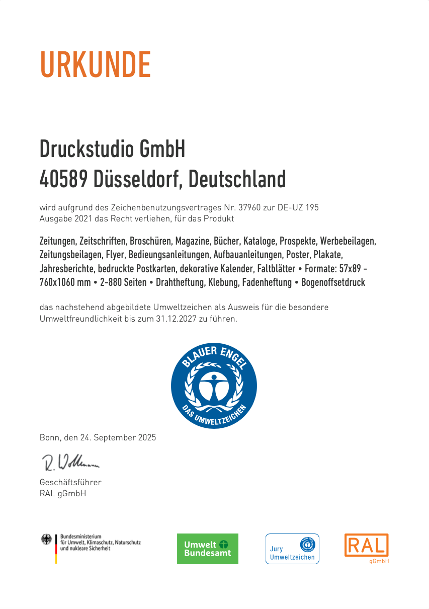 Print products from Druckstudio GmbH are certified to the criteria of the Blue Angel. This certification serves as evidence that an exceptionally ecofriendly approach is being pursued throughout the entire print production value chain.