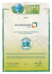 Seit Juli 2021 ist die Druckstudiogruppe mit der internationalen Auszeichnung „GREEN BRAND“ zertifiziert.